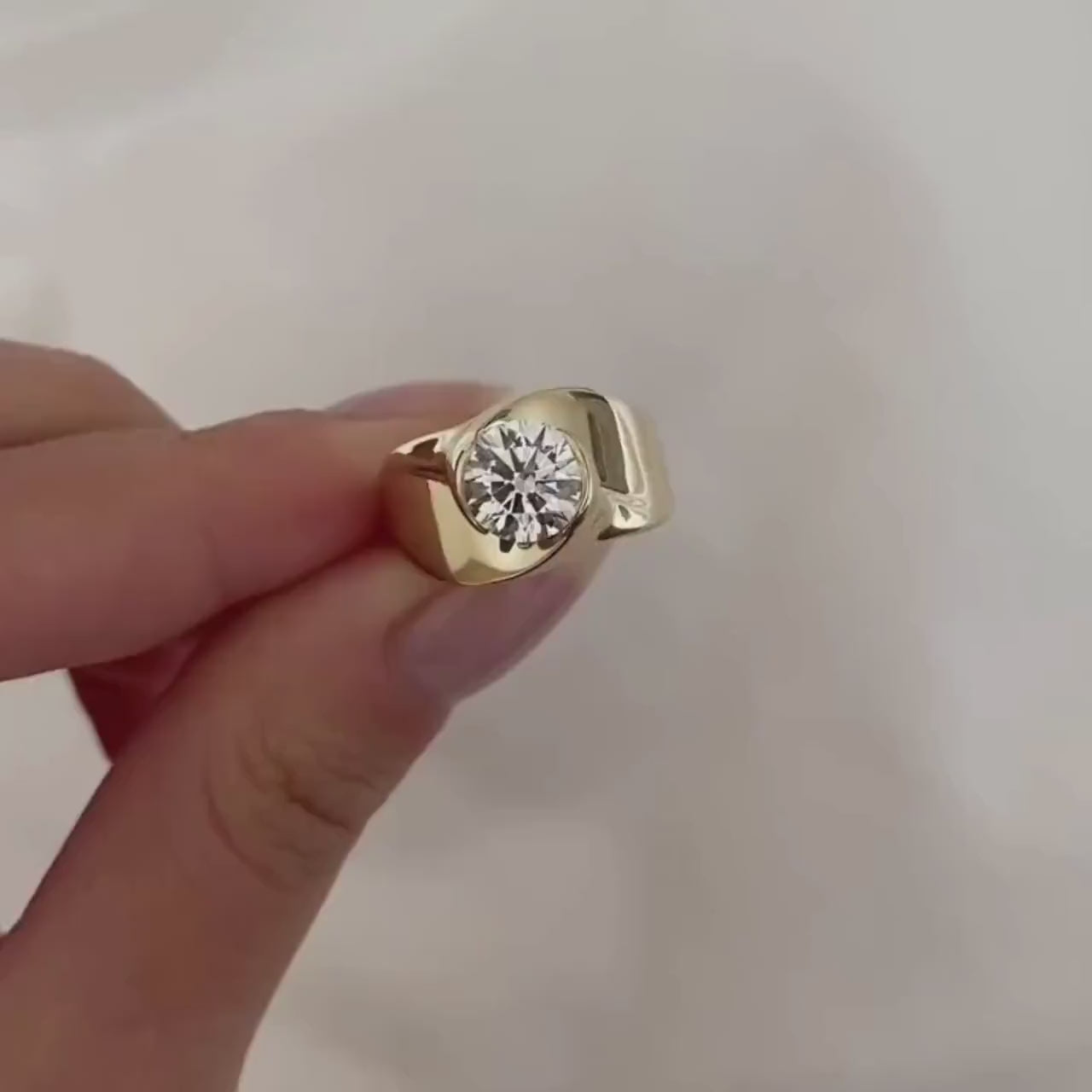 Make a bold statement with this 1.00ct round lab-grown diamond bezel-set in a wide gold cigar band. IGI certified, DEF color, VVS–VS clarity. Available in 10k, 14k, or 18k gold. Ethically made and fully customizable for the modern bride.