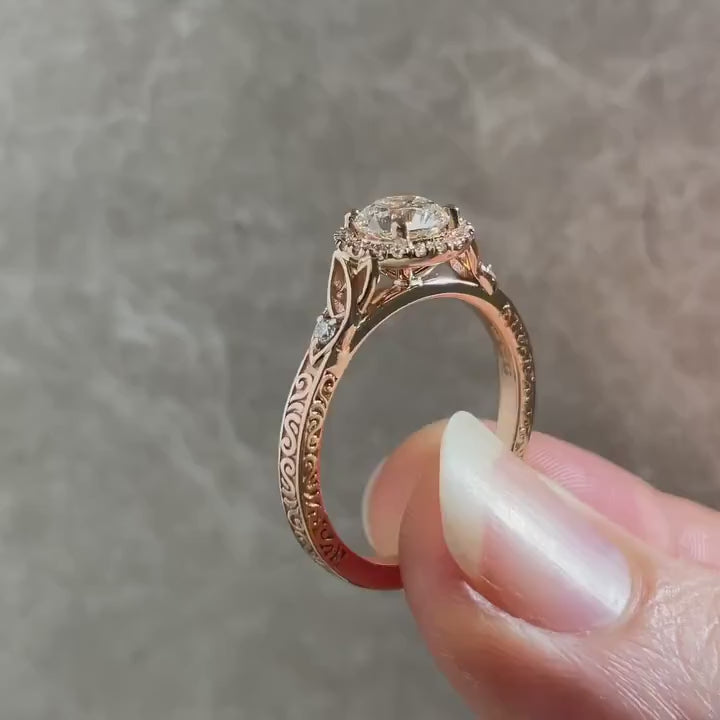 Celebrate love with this 1.20ct Lab Grown Diamond Halo Cathedral Ring, featuring a 1.00ct round center and 0.20ct halo stones. Crafted in 10k/14k/18k rose gold, IGI certified, and handcrafted—ideal for engagements, anniversaries, or milestone moments.
