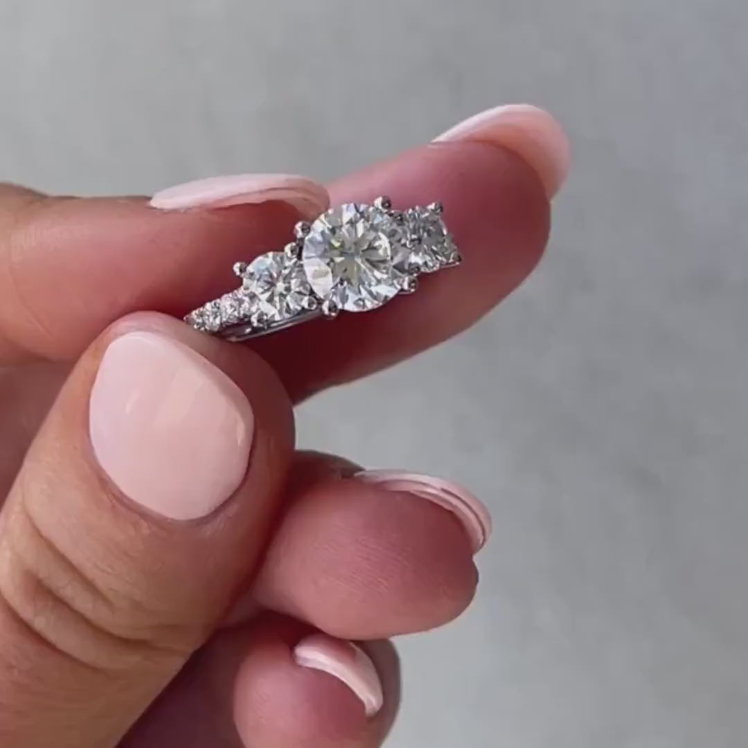 This 2.70tcw lab-grown diamond engagement ring features a 2.00ct round center with 0.70ct round side stones. IGI certified, ethically sourced, and handcrafted in white gold—perfect for a timeless and sustainable proposal.