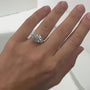 ● Design – Antique-inspired three-stone silhouette with geometric side stones