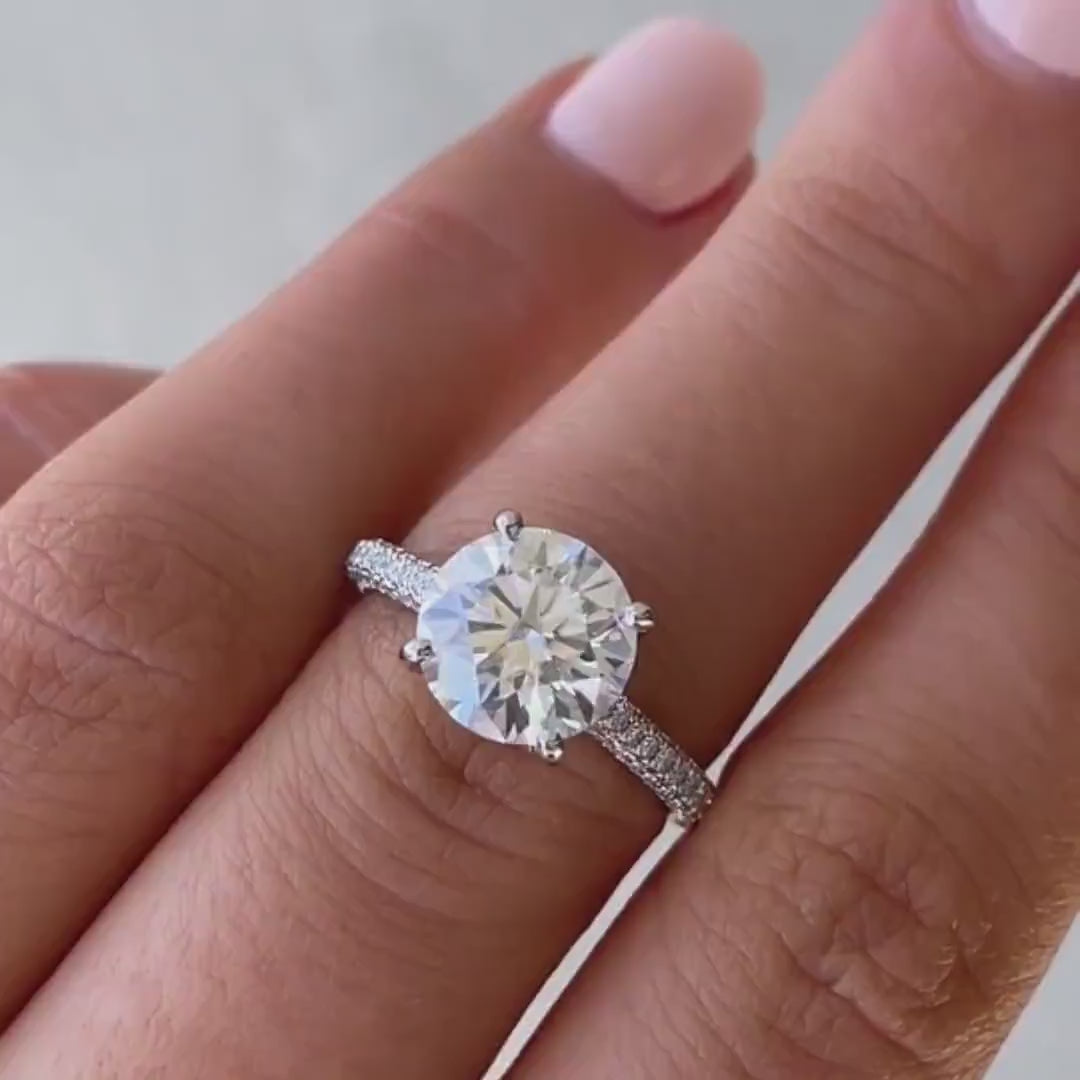 Shine from every angle with this 2.70tcw Round Lab Diamond Engagement Ring, featuring a 1.50ct center, triple pavé band, and hidden halo. Handcrafted in white gold and IGI certified — a bold, elegant, and ethical symbol of love.