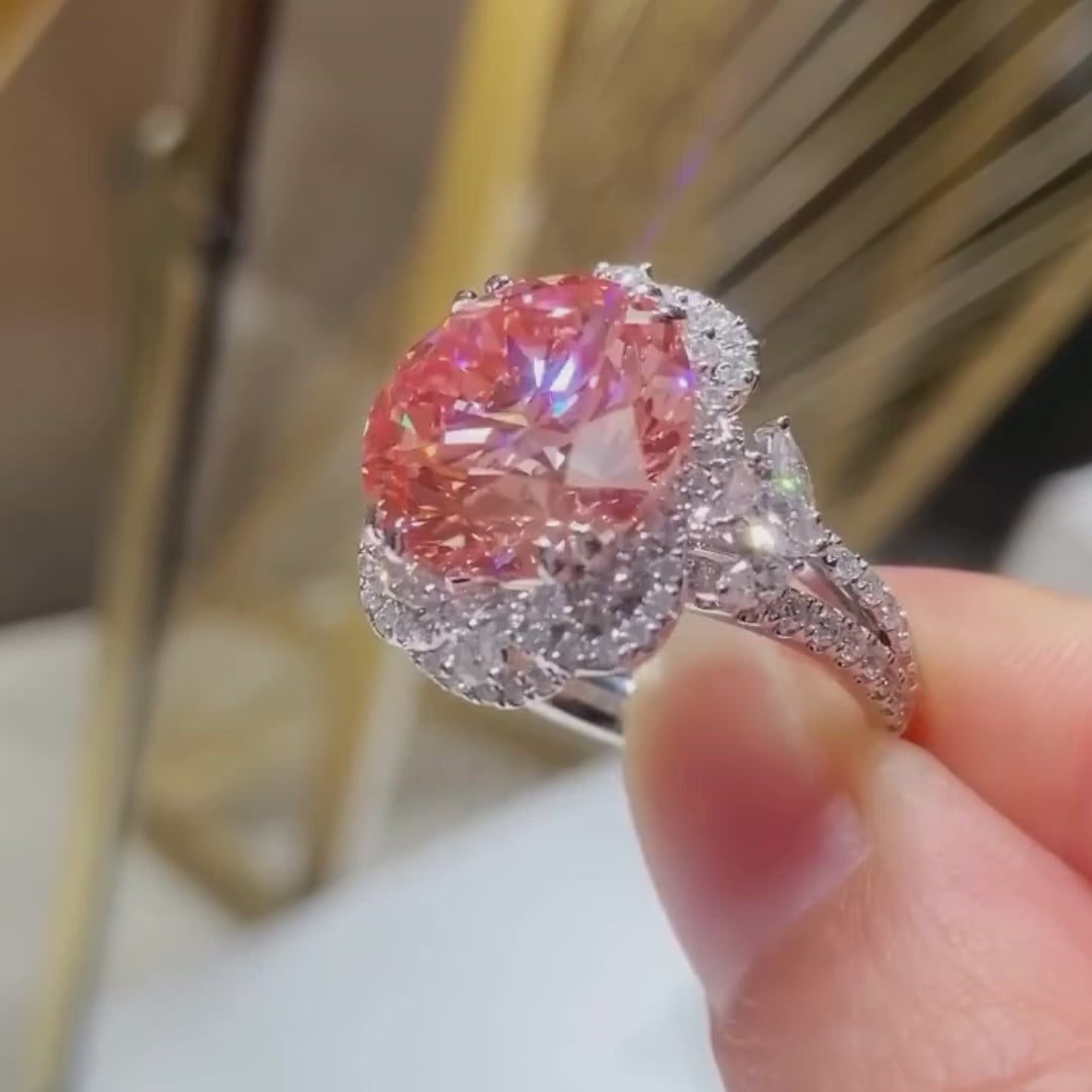 This Round 4.50tcw Fancy Pink Lab-Grown Diamond Engagement Ring is a bold expression of elegance. The stunning 2.50ct round center stone in a vibrant fancy pink hue is flawlessly surrounded by a double halo of brilliant white diamonds totaling 2.00ct, all set in a luxurious 14k/18k white gold band.