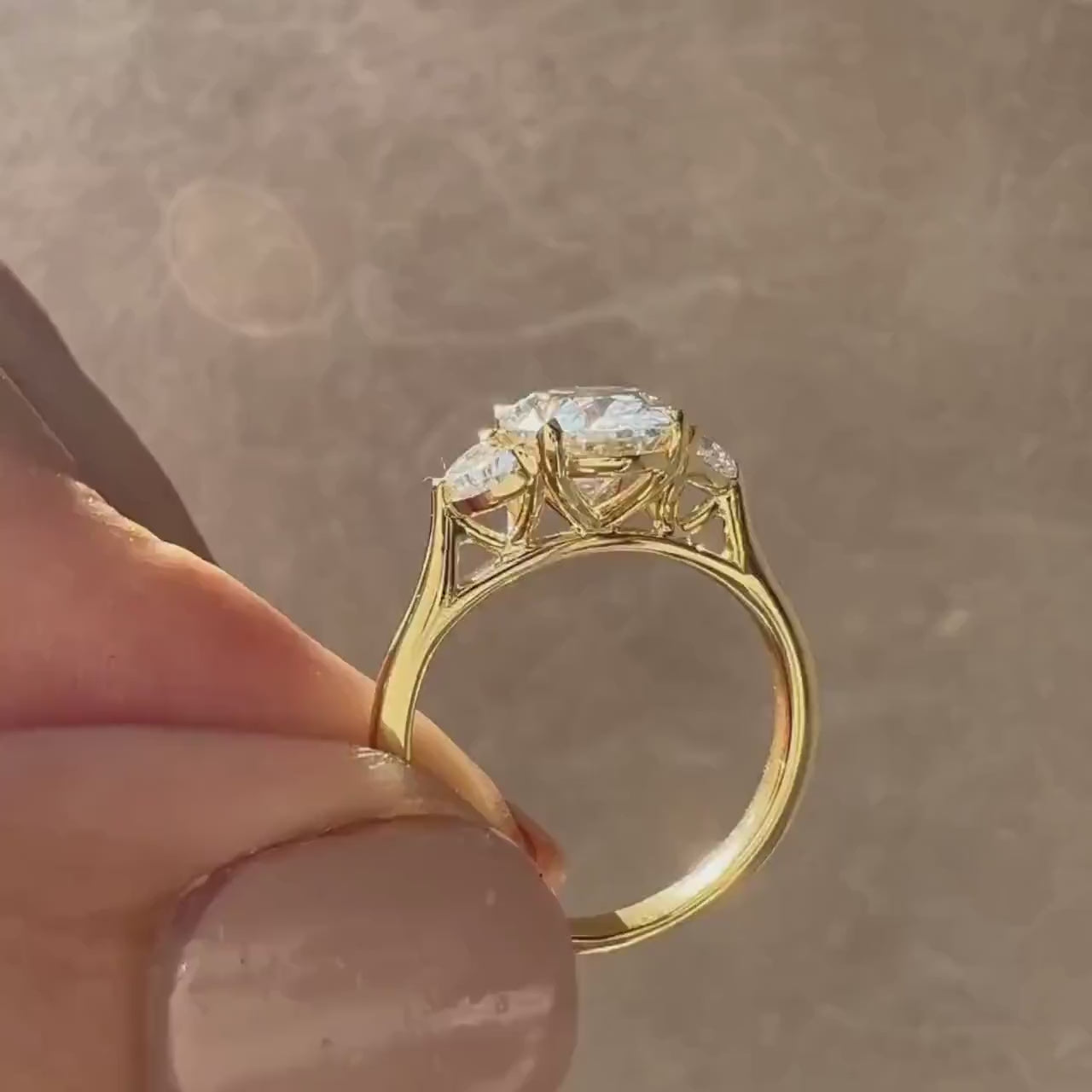 Yellow Gold Oval Lab Diamond Ring | 2.40tcw Three Stone with Half Moon Sides | IGI Certified